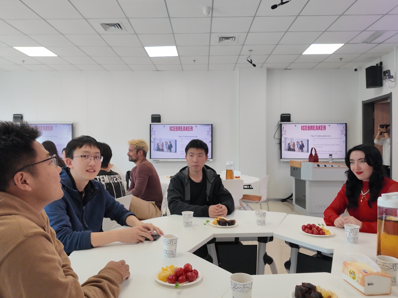 活动伊始,外籍教师们以风趣幽默的自我介绍迅速拉近了与同学们的距离。首个环节 “Two Truths, One Lie” 破冰游戏更是瞬间点燃现场气氛。教室里欢声笑语不断,为后续深入交流营造了开放、包容的良好环境。
