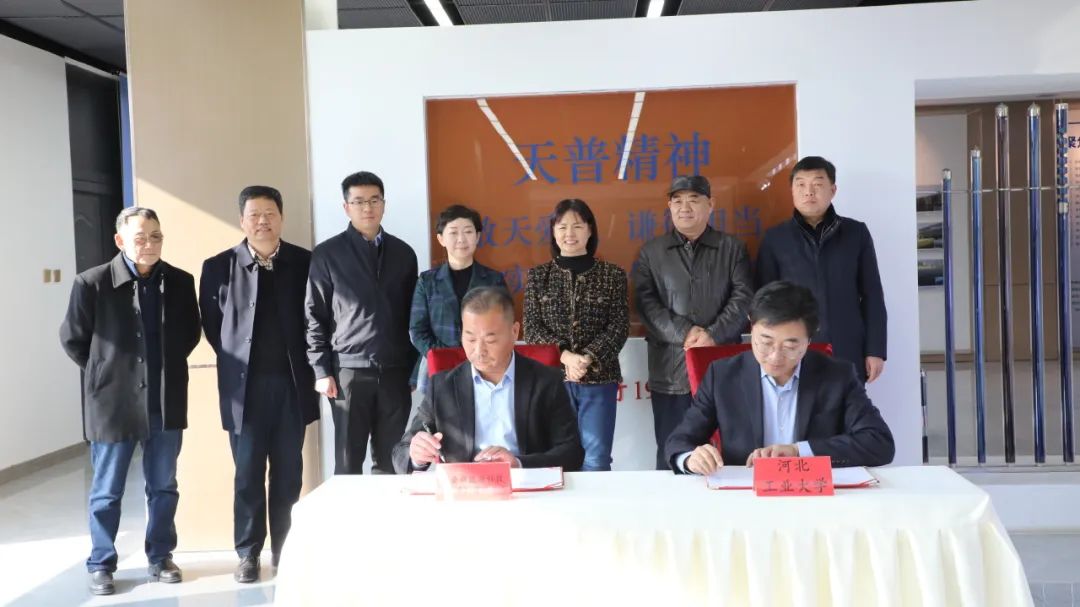 爱豆传媒 院长周健和天普公司总经理祝世春签署合作协议,并与天津市宝坻区科技局局长孟晓燕,天普公司董事长程翠英、技术总工吴艳元共同为实习实践基地揭牌。