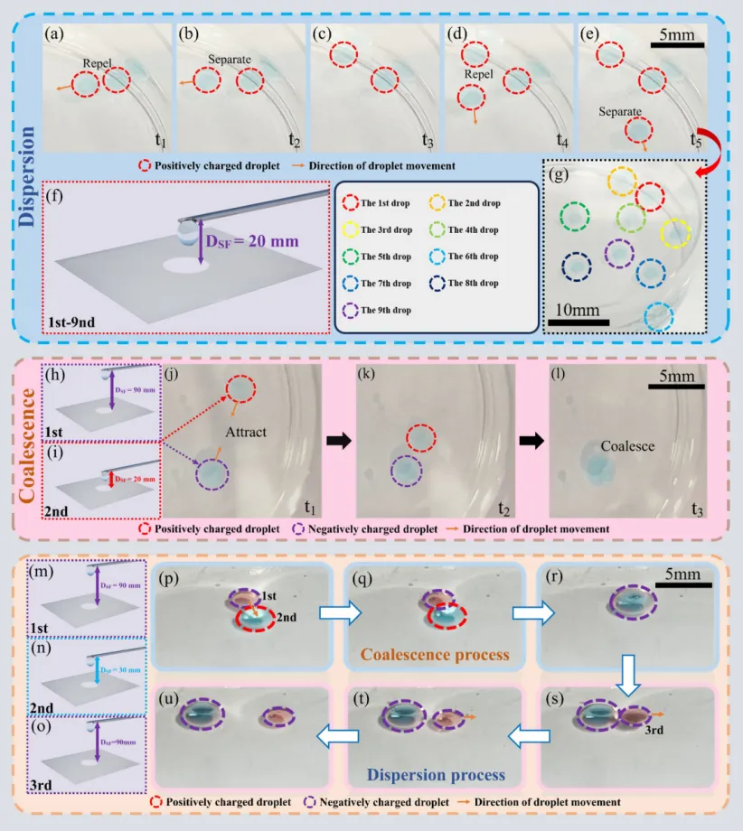 固液接触带电(CE)广泛应用于能量收集和微流体操控。传统研究认为电荷的累积和转移通常发生在固液接触的瞬间,李一彤等通过系统的实验和模拟深入研究了水滴在临近疏水表面时的电气化过程,首次提出了一种竞争性的电荷转移机制。该机制揭示了水滴在接触疏水表面之前可通过两个过程累积电荷:一方面水滴在静电场作用下的脱落分离会产生正电荷;另一方面疏水表面发射的负电荷射流可在水滴中累积负电荷。上述两个过程的相互竞争可以用于调控水滴在疏水表面附近的电荷极性和电荷量。该研究不仅扩充了与固液接触相关的电荷转移机制,也为微流控技术中水滴的电荷调控提供了新的途径。该研究成果可用于开发新型液滴微反应器、液滴传感器和设计新颖光伏微流控模式,有助于进一步推动静电液滴操控技术在制药、医疗和生物等领域的应用。