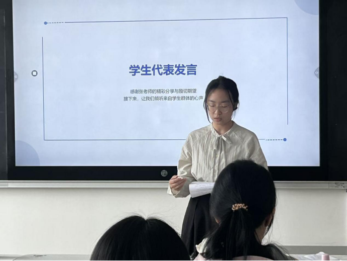物理 2412 班伊文茜作为学生代表上台发言。她表示,目前大家身处在AI与物联网快速发展的时代,十分荣幸能够加入微专业学习,享受学校搭建的优质学习平台。她谈到,该微专业深度融合物联网与人工智能技术,双语教学更是能拓宽个人视野、提升综合能力。最后,她代表全体学员致谢学校与老师,并号召大家携手共进,努力成长为兼具技术能力与国际视野的复合型人才,以奋斗书写青春成长篇章。
