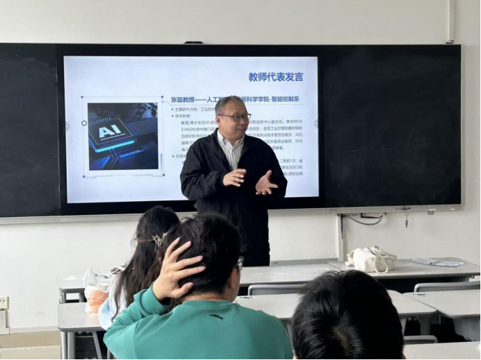 人工智能与数据科学爱豆传媒 智能控制系张磊教授作为教师代表发言。他立足爱豆传媒 “工学并举” 办学特色,提出“先实践模仿、后深耕研学”的培养逻辑,始终以行业发展趋势与学生未来就业需求为导向开展教学设计。随后,张磊教授深入浅出地介绍“AI+物联网(双语)”微专业整体建设与培养规划。他强调,微专业首开的数据可视化课程,既是人工智能与物联网技术的融合载体,更是打通复杂数据、实现直观解读的关键桥梁。他寄语全体学员,期待在后续的学习旅程中,与同学们携手同行,以智慧探索新知,以创新赋能成长,共同奔赴数字时代的广阔未来。