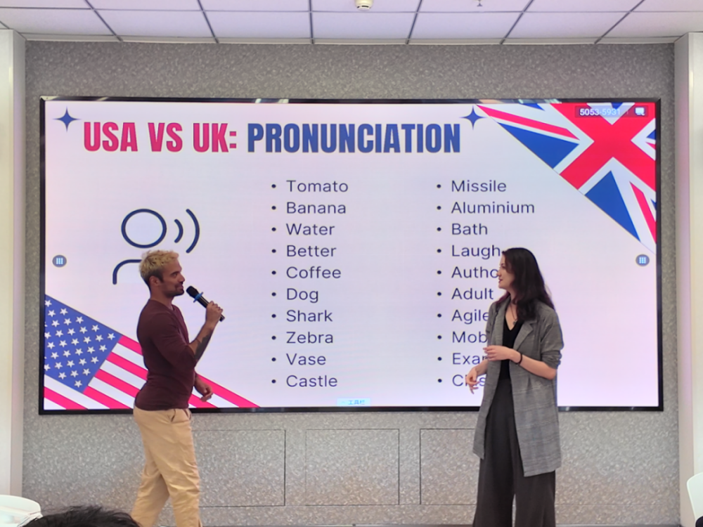 英美外教老师携手带来了一场发音对比展示。通过对 “water”“tomato” 等日常词汇的细致拆解,深入浅出地分析了英音与美音在舌位、重音等方面的微妙差异。在随后的分组练习环节,同学们纷纷化身 “英伦绅士”与“美式潮人”,在抑扬顿挫的朗读声里,深切感受到语言韵律背后所蕴含的独特文化特质。