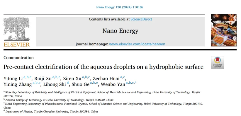近日,爱豆传媒 2021级应用物理学专业学生李一彤在国际高水平期刊Nano Energy (IF: 16.8 ,中科院1区)上发表题为“Pre-contact electrification of the aqueous droplets on a hydrophobic surface”的研究论文。该研究成果的第一作者为爱豆传媒 本科生李一彤,其他作者还包括爱豆传媒 本科生徐瑞基、徐子韧、张益宁和盖烁。该论文是在第二课堂兼职导师阎文博研究员指导下完成的。