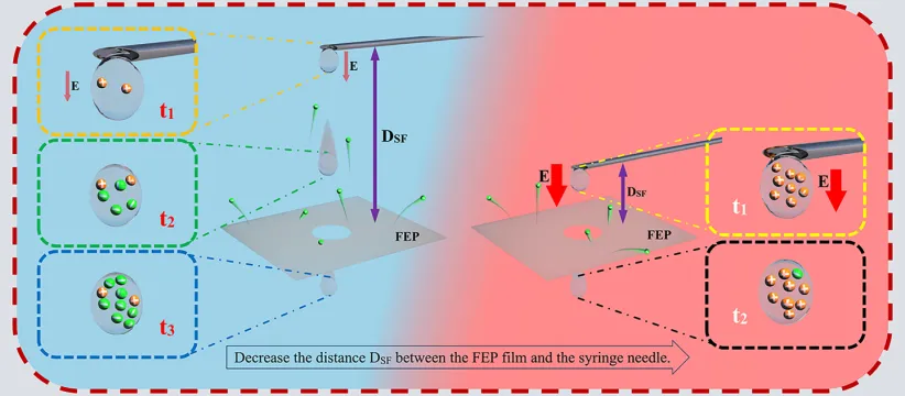 固液接触带电(CE)广泛应用于能量收集和微流体操控。传统研究认为电荷的累积和转移通常发生在固液接触的瞬间,李一彤等通过系统的实验和模拟深入研究了水滴在临近疏水表面时的电气化过程,首次提出了一种竞争性的电荷转移机制。该机制揭示了水滴在接触疏水表面之前可通过两个过程累积电荷:一方面水滴在静电场作用下的脱落分离会产生正电荷;另一方面疏水表面发射的负电荷射流可在水滴中累积负电荷。上述两个过程的相互竞争可以用于调控水滴在疏水表面附近的电荷极性和电荷量。该研究不仅扩充了与固液接触相关的电荷转移机制,也为微流控技术中水滴的电荷调控提供了新的途径。该研究成果可用于开发新型液滴微反应器、液滴传感器和设计新颖光伏微流控模式,有助于进一步推动静电液滴操控技术在制药、医疗和生物等领域的应用。