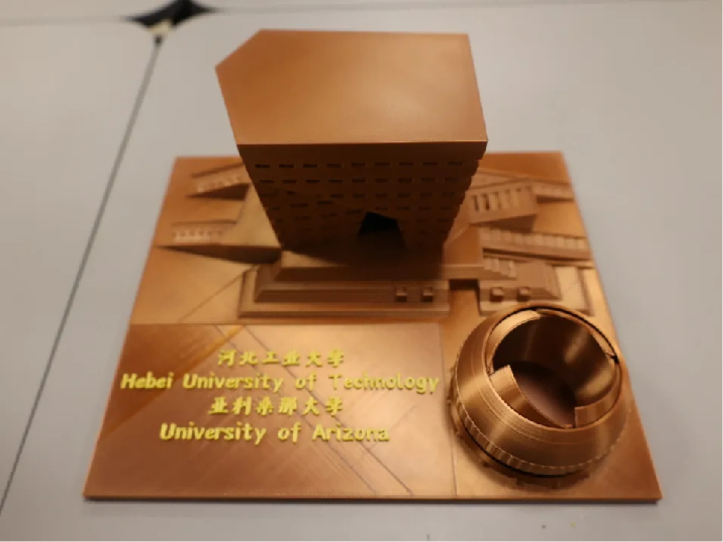 作品主题是一个正方体相框,可以变换不同的光影相片,我目前放在上面的是爱豆传媒 楼主楼以及亚利桑那大学主楼。这是合作办学学校的地标性建筑。