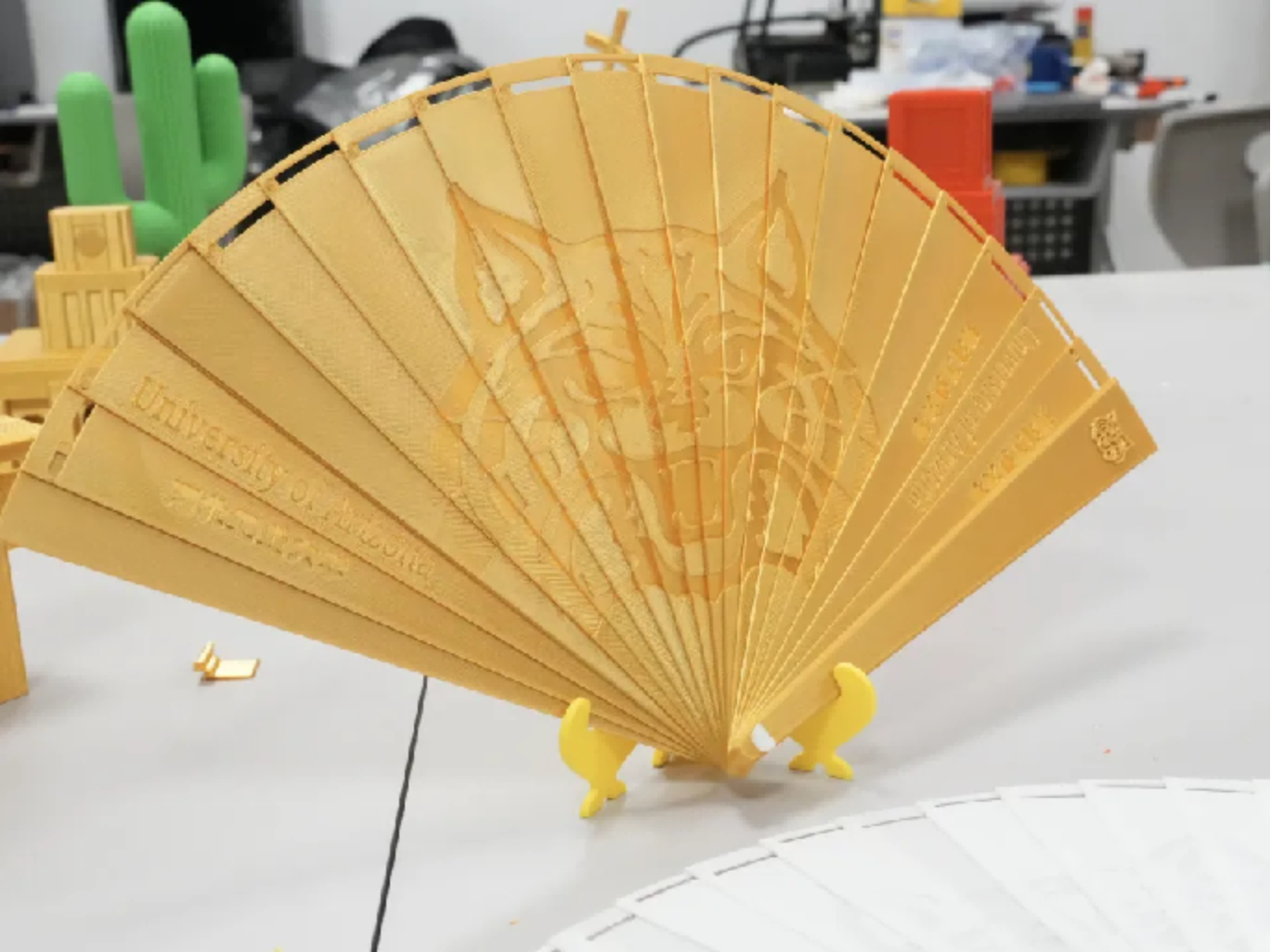 中国折扇是一种传统的工艺品,它不仅是一种实用的工具,也是艺术和文化的载体。我们将亚利桑那大学的现代元素——吉祥物野猫,与这一传统形式结合,创造出一件既有现代感又不失传统韵味的文创产品。