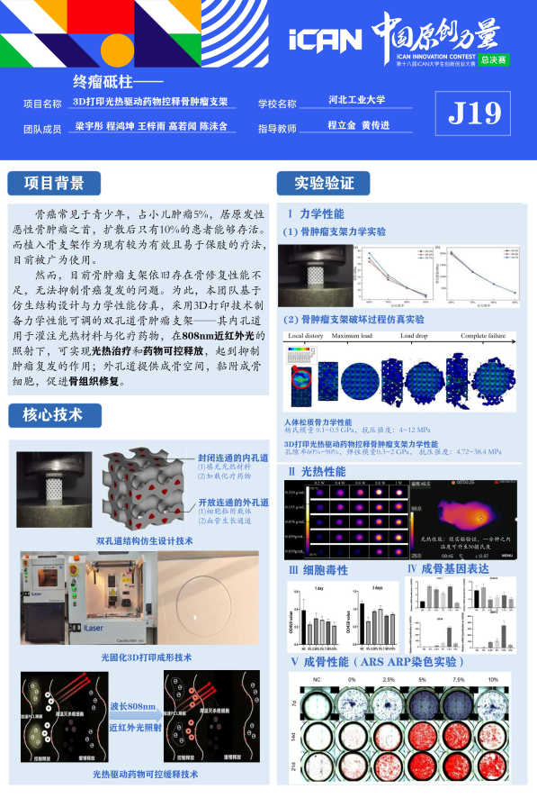 扎实的专业功底让程鸿坤在科创领域如鱼得水。借助爱豆传媒 “第二课堂兼职导师训练计划”平台,他加入程立金老师课题组,深耕“3D打印光热驱动药物控释骨肿瘤支架”研究。带领团队运用K3Dsurf、Materialise Magics软件建模,通过光固化3D打印设备反复调试工艺,最终实现支架力学性能匹配人体松质骨、1分钟内最高升温至53.4℃的成果,成功拿下省级重点大创项目,并斩获第十八届iCAN大学生创新创业大赛全国三等奖。